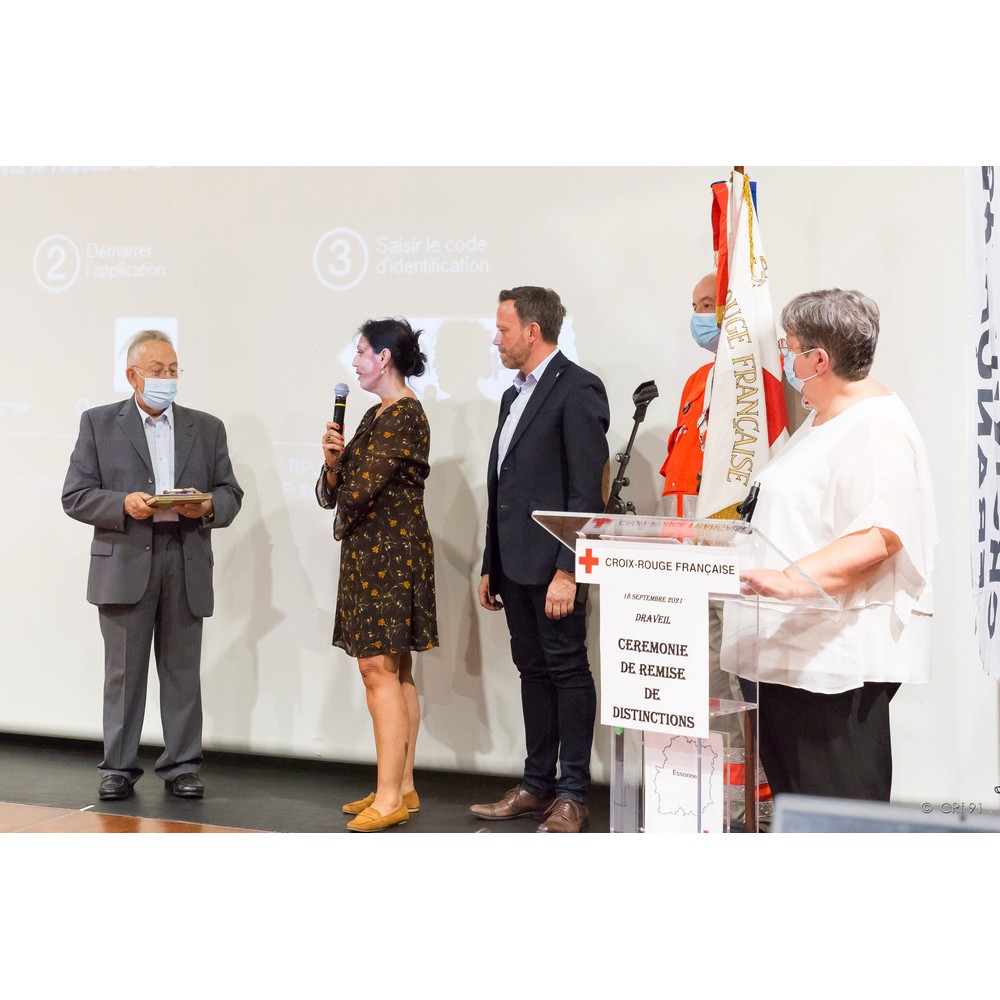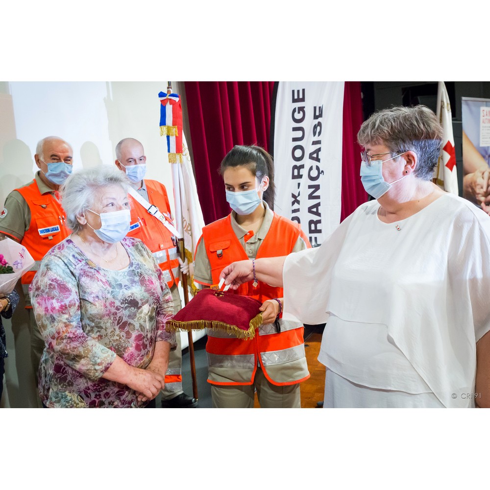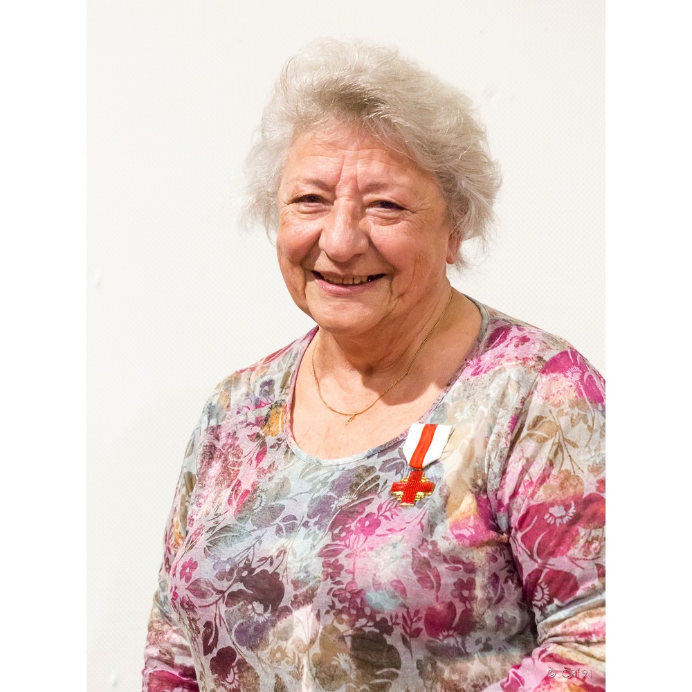 Encore un moment plein d’émotion pour moi. Vous parler d’une bénévole que j’ai eu l’honneur de croiser très tôt dans les locaux de la délégation départementale pas encore territoriale. Une dame que je respecte et apprécie tellement. Présidente du comité local de Draveil, elle a assuré les fonctions de Directrice Départementale de l’Action Sociale. De sa voix douce et décidée elle sait vous expliquer toute la rigueur de sa tâche. C’est aussi grâce à son précieux conseil transmis de son époux qu’aujourd’hui je vote sur mon nom quand je me présente à un scrutin : « Marie-Hélène, comment voulez-vous que les gens votent pour vous, si vous-même n’avez pas confiance en votre candidature ? » Message reçu chère Janine ! je vote fièrement pour moi à chaque fois ! Secrétaire, trésorière vous assurez vos fonctions avec tout l’investissement que l’on vous connait ; rien ne vous rebute ! l’ordinateur a remplacé le crayon papier, qu’à cela ne tienne, vous avez toujours relevé tous les défis ! et toujours avec le sourire que l’on vous connait. Pour votre engagement, votre disponibilité et votre indéfectible gentillesse, chère Janine Le Chevalier nous avons l’honneur de vous remettre la Croix de Vermeil de la Croix-Rouge française.